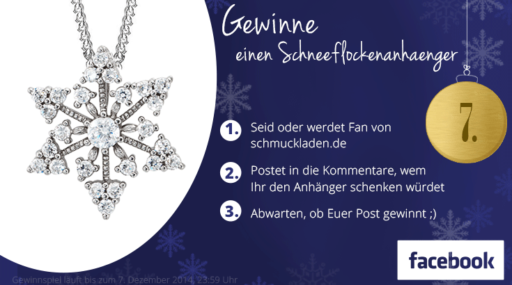 Heute haben wir schon den 2. Advent und was heißt das? Ganz genau, im schmuckladen.de-Adventskalender gibt es wieder etwas zu gewinnen! Wenn ihr heute auf unserer Facebook-Seite vorbeischaut, habt ihr die Chance, einen Schneeflocken-Anhänger aus Sterlingsilber zu gewinnen, der mit lauter funkelnden Zirkonia-Steinen besetzt ist.