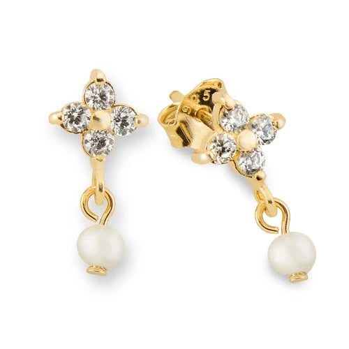Diese zierlichen und schillernden Ohrringe aus Perlen und Zirkoniasteinen ergänzen Deinen Lieblingslook mit Raffinesse. Die Ohrringe präsentieren glänzende 3mm Süßwasser-Perlen, die unter funkelnden Zirkoniasteinen in Form einer Blume schwingen. Diese Ohrringe bestehen aus 925 Sterlingsilber, sind auf Hochglanz poliert und verfügen über einen Schmetterlingverschluss.