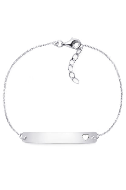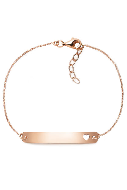 Filigranes Armband mit einer Gravurplatte, die du individuell gravieren kannst! In die Gravurplatte ist ein kleines Herz eingestanzt. Das Armband ist aus echtem Sterlingsilber in silber, rosé oder gold erhältlich. Die Oberfläche ist hochglanzpoliert.