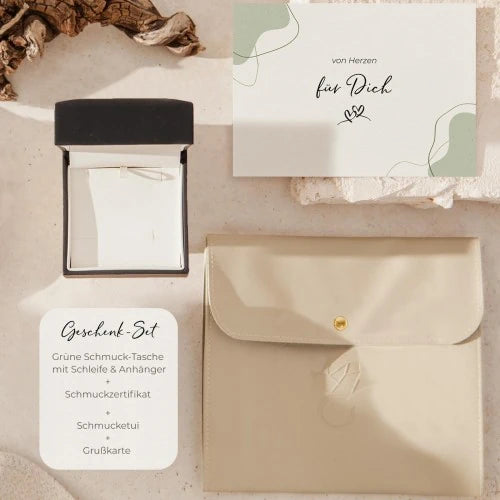 Das Schmuckset ist bereits fertig zum Verschenken in einem edlen Etui verpackt, dieses befindet sich in einer dezenten, aber exklusiven Schachtel. Wählen Sie passend zum Geschenkmoment Ihre Etuigravur aus. Außerdem erhalten Sie ein zu Ihrer Halskette und Ohrringen mit Herzsteinen das passende Schmuck-Zertifikat, welches die verwendeten Materialien auszeichnet.