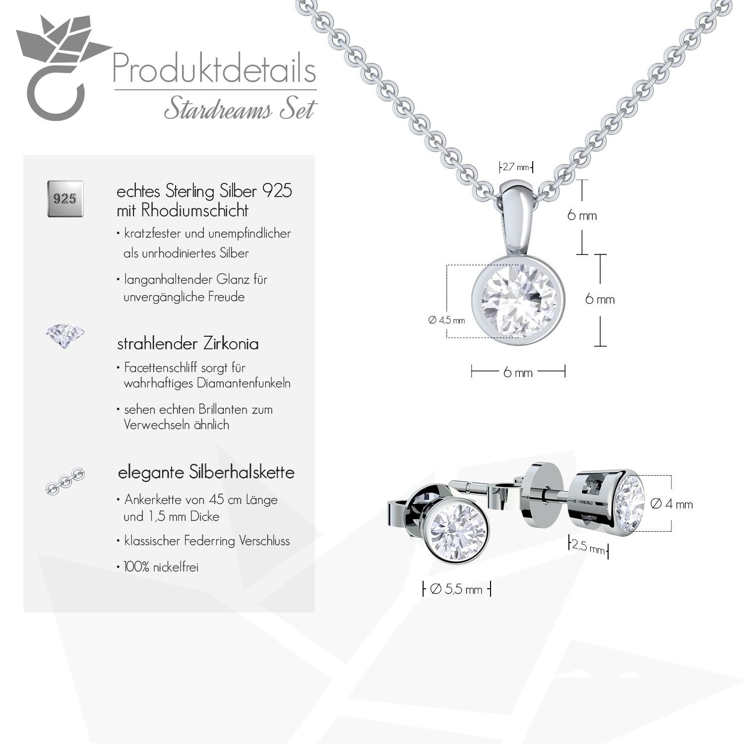 Sie erhalten das Set inklusive gravierbarem Schmucketui und Echtheitszertifikat in einer wunderschönen Geschenkverpackung. Wählen Sie passend zum Geschenkmoment Ihre Etuigravur aus. Außerdem erhalten Sie ein zu Ihrer Halskette und Ohrringen mit Zirkonia das passende Schmuck-Zertifikat, welches die verwendeten Materialien auszeichnet.