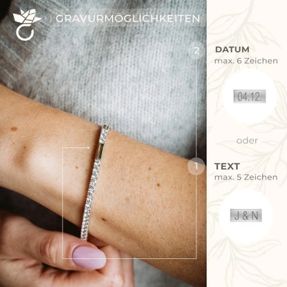 Unser funkelndes Tennisarmband "Match" besteht aus hochwertigem Silber 925 Rosegold vergoldet mit 47 Zirkoniasteinen reihum und ist 18cm lang. Dieses Armband ist ein Geschenk von Herzen für die schönsten Augenblicke im Leben. Zudem kann dieses Traumarband bis zu 5 Zeichen graviert werden.