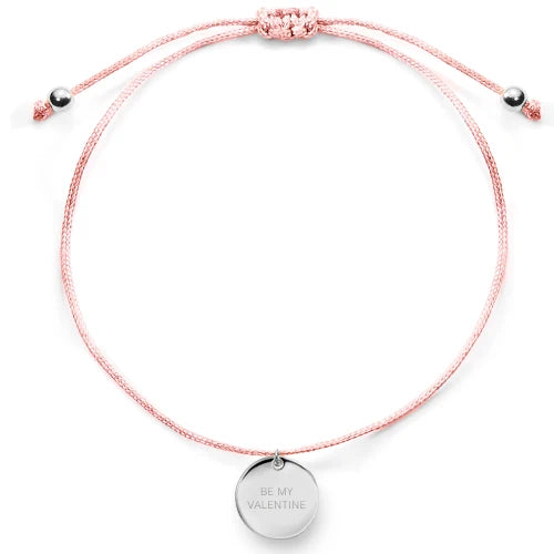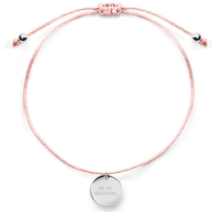 Ein schlichtes Stoffbändchen in einer zarten Farbe wird kombniert mit einem schlichten Anhänger mit der Aufschrift "BE MY VALENTINE" auf der Vorderseite.