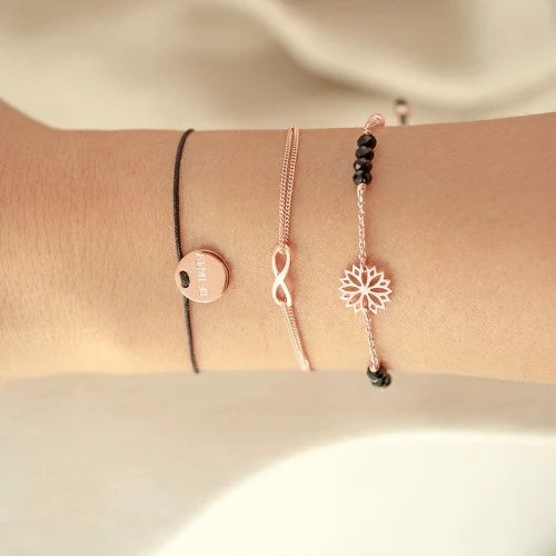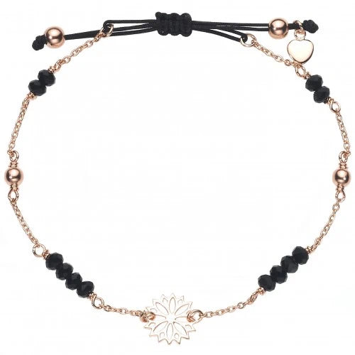 Zauberhaftes Armband in 925 Sterlingsilber mit einem floralen Ornament in der Mitte. Das rosévergoldete Armband wird mit kleinen schwarzen Glassteinchen verziert.