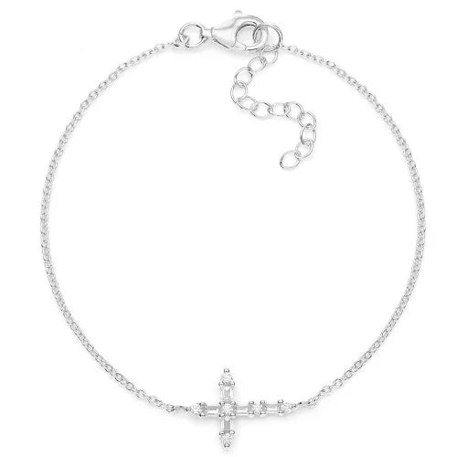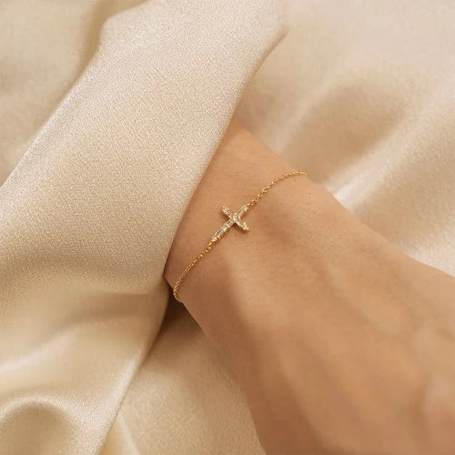 Kreuzschmuck wird als Symbol für Glauben, Hoffnung und Liebe verwendet. Unser Armband mit kreuzförmigem Anhänger ist eine perfekte Mischung aus Weiblichkeit, Eleganz und Zeitlosigkeit. Der Kreuzanhänger besteht aus 925 Sterlingsilber und ist mit weißen runden Zirkoniasteinen besetzt. Das Kreuzarmband ist ein hochwertiger Ganztagsschmuck, welcher Dein Outfit gekonnt aufwertet.