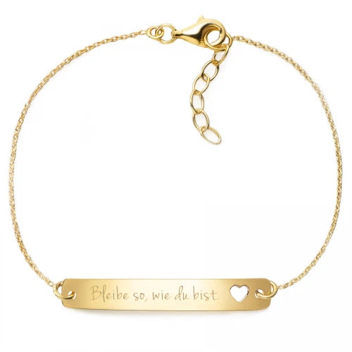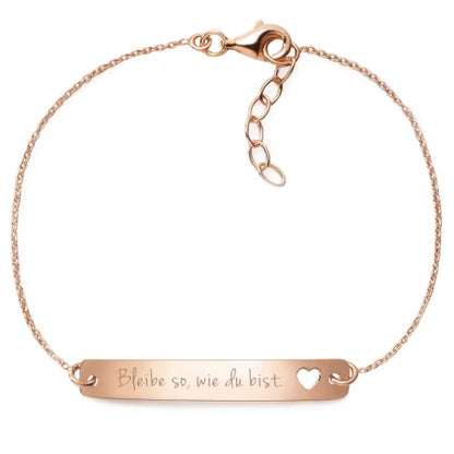 Süße Geschenk-Idee: Armband aus echtem Sterlingsilber mit dem Schriftzug "Bleibe so, wie du bist" auf der Vorderseite der Gravurplatte. Ein kleines ausgestanztes Herz ist ein weiteres liebevolles Detail.