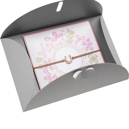 Wünsche Deinen Lieben viel Glück mit unserer Glückskarte, welche jedes Schmuckstück noch spezieller und bedeutungsvoller macht. Die Glückskarte mit dem Kleeblatt-Armband ist ein perfektes Geschenk für neue Lebensabschnitte, wie zum Beispiel zum Gratulieren zu einem neuen Job oder beim Umzug in eine neue Stadt. Wir verschicken die Karte mit einem silbernen Umschlag mit einem Herzverschluss. Damit kannst Du das Armband sofort verschenken und brauchst Dir keine Gedanken um eine Geschenkverpackung machen.