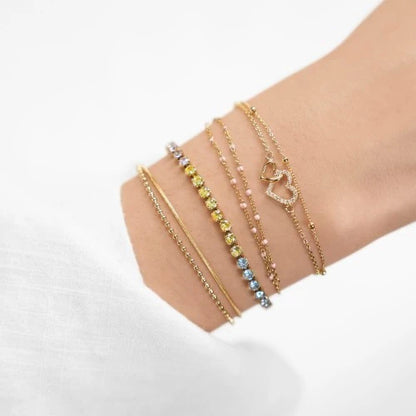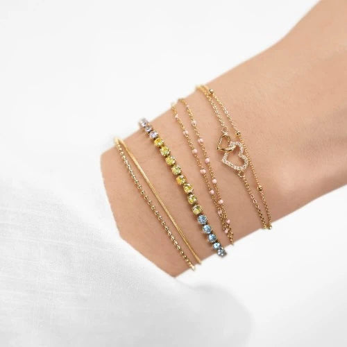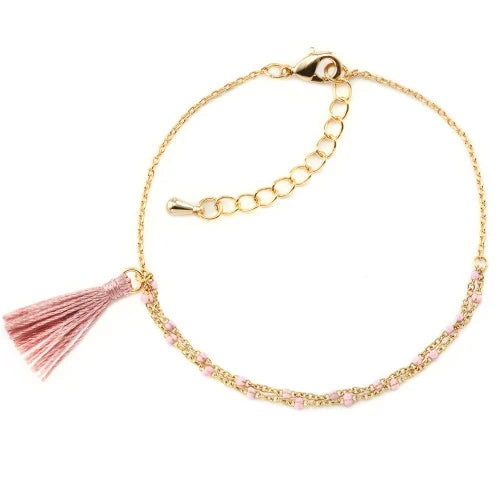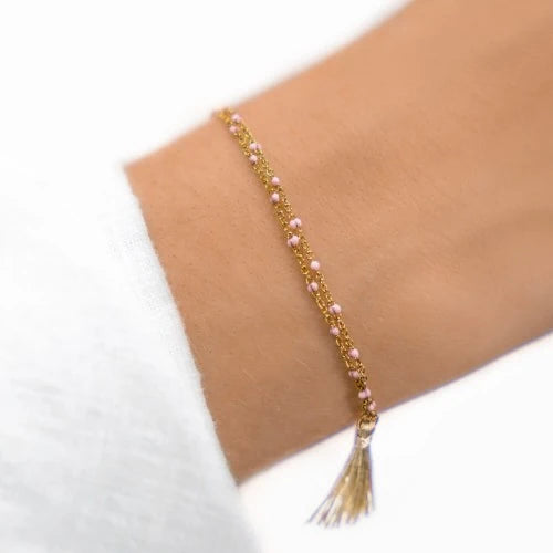 Unser Armband begeistert mit seinem filigranen Design, wodurch er sich als ein Everyday Piece für alle Fälle eignet. Die zarte Kette aus gelbvergoldetem 316L Edelstahl ist kombiniert mit kleinen rosa Perlen und einer rostrosen Puschel, die als eine aufregende Highlight dieses Armband gilt. Das Mix aus Glamour und Verspieltheit macht dieses Armband zu einem Must-Have.