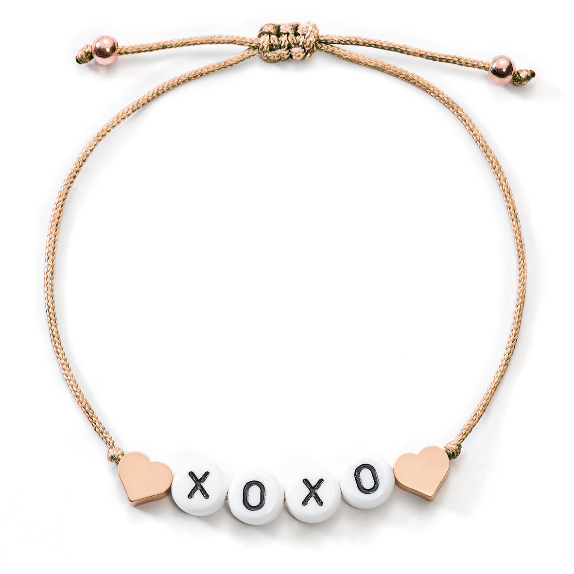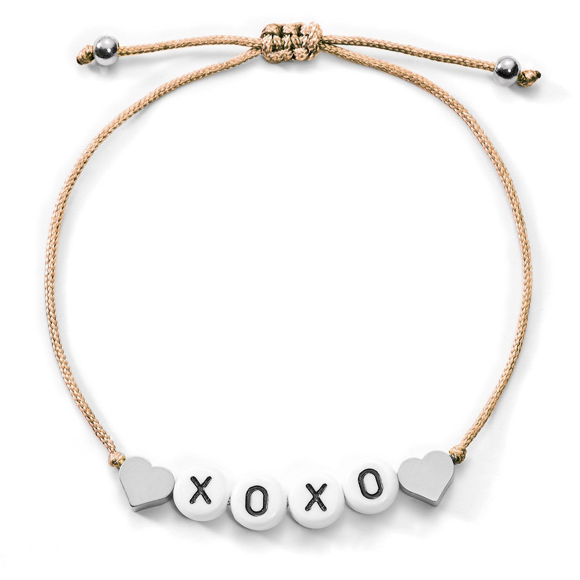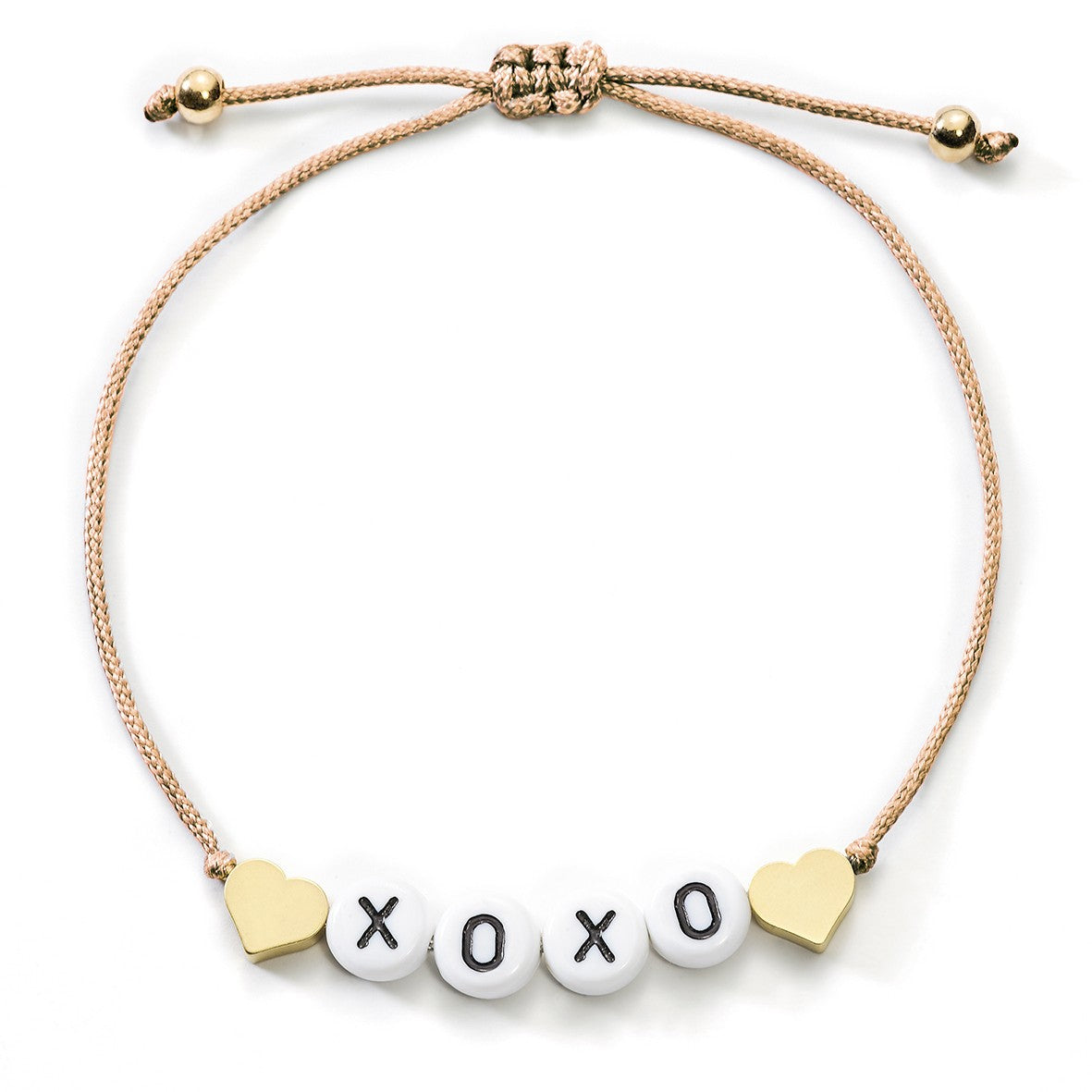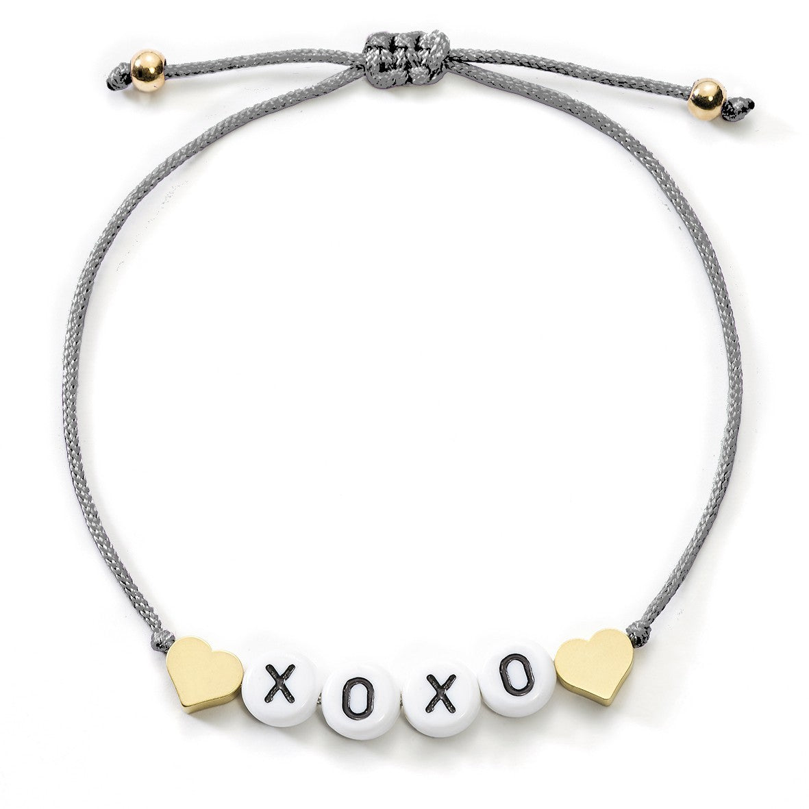 XOXO - Kisses and Hugs gibt es mit diesem stylishen Stoff-Armband bestimmt von allen Seiten! Das Stoffbändchen ist verziert mit kleinen gravierbaren Herzen. So kannst du ein ganz persönliches Armband kreieren, was dich durch den Tag begleitet.