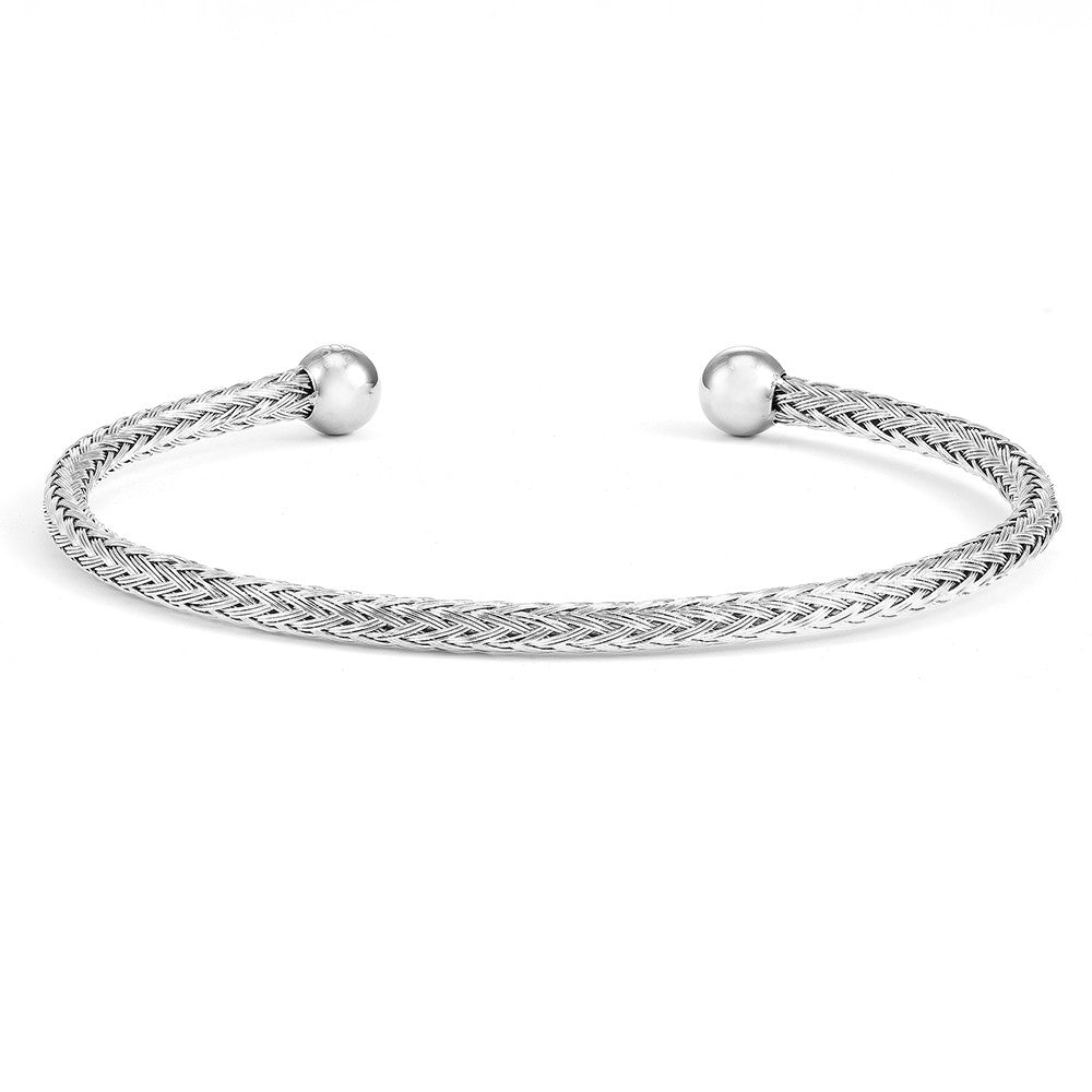 Dieser schöne Armreif besteht aus kleinen Edelstahldrähten, die spiralförmig geflochten sind. Das 3mm-breite Armband ist an jedem Ende mit abgerundeten Edelstahlkappen versehen, um sicherzustellen, dass sich nichts an Deiner Kleidung verfängt oder Deine Haut kratzt.