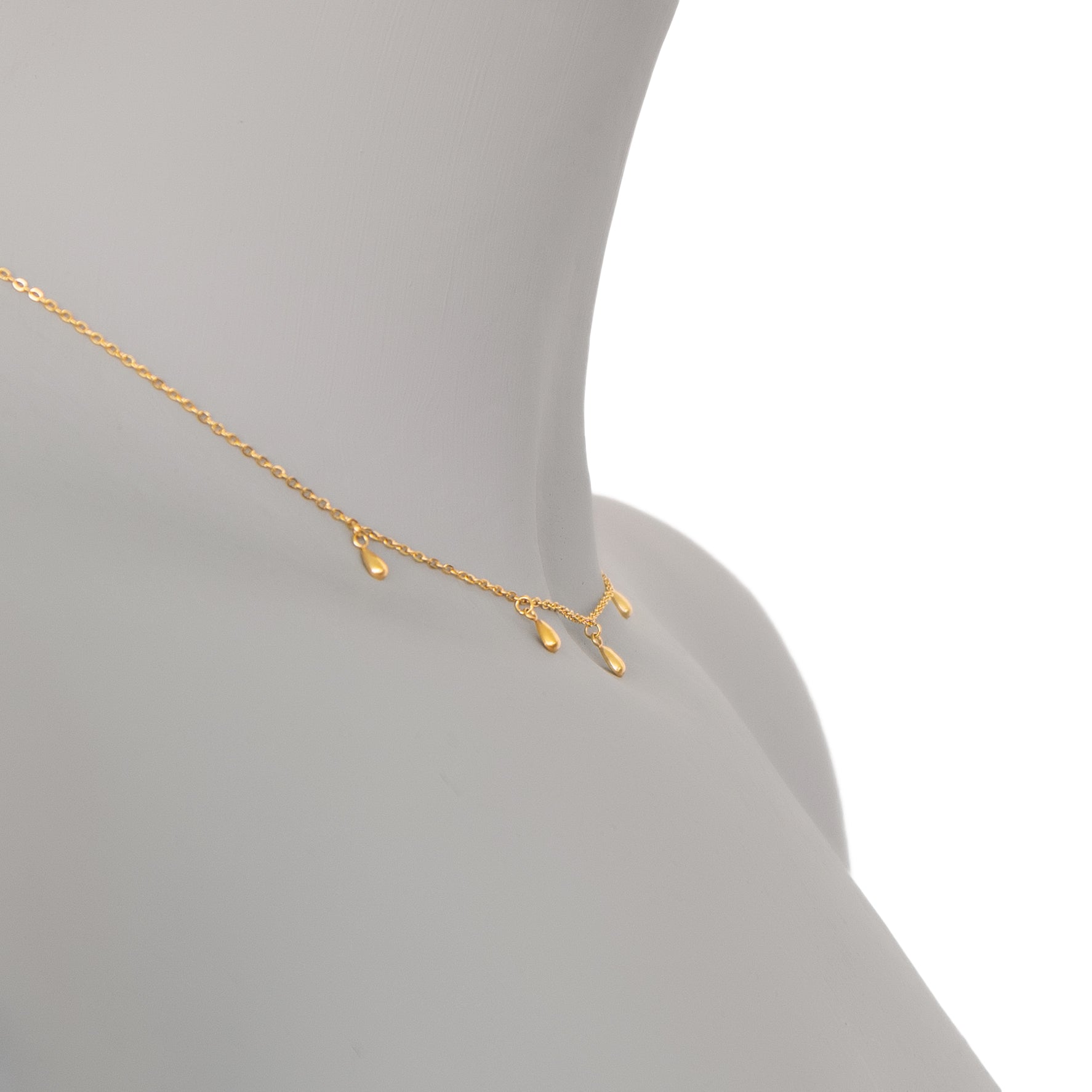 Fünf kleine, polierte Tropfen baumeln von der filigranen Halskette und verleihen dem Look Zärtlichkeit und Weiblichkeit.