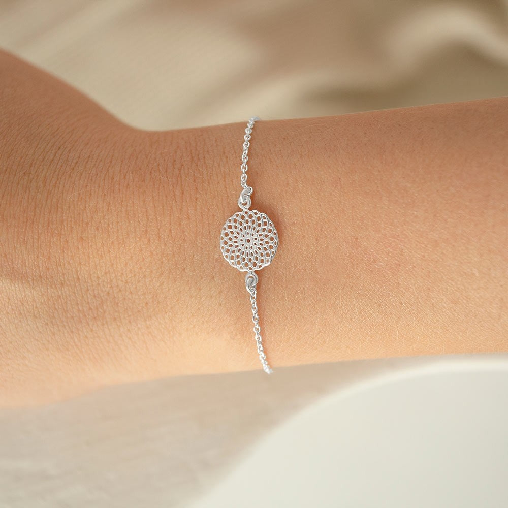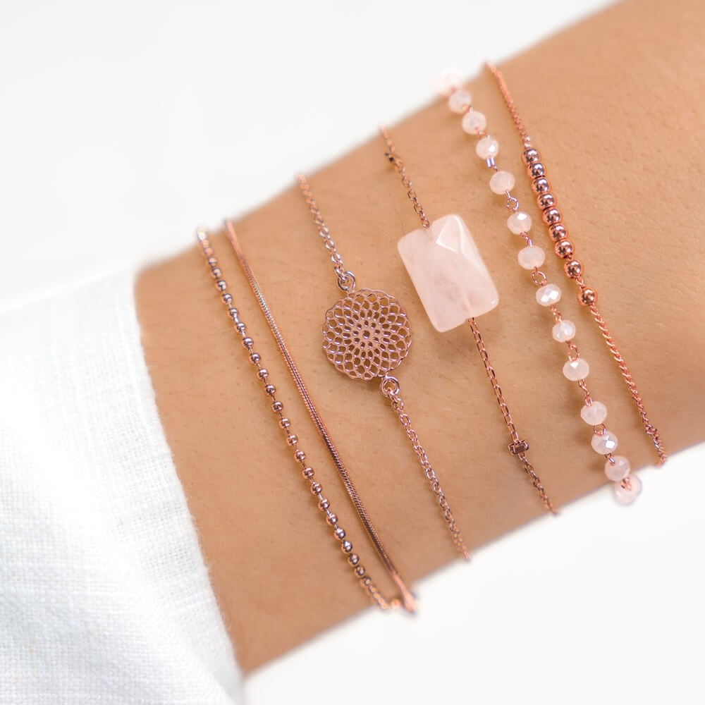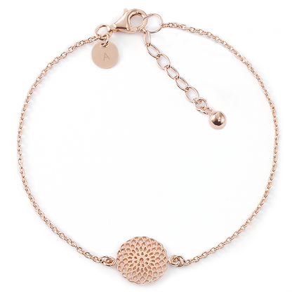 Sommerfreude und ein wenig Boho-Charme versprüht das filigrane roséfarbene Armband mit floralem Blumen-Anhänger. Ein kleiner Anhänger, welcher individuell mit einem Initial oder einem Zeichen (z.B. Herz oder Infinitysymbol) graviert werden kann, sorgt für Individualität dieses Armbands.