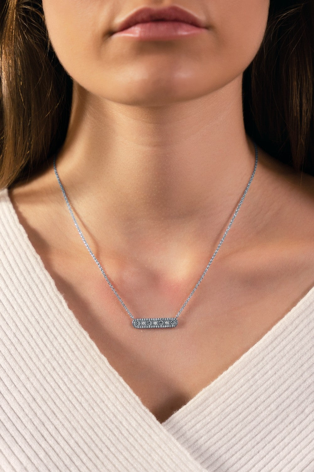 Wenn Du ein einfaches Accessoire mit klaren Linien benötigst, ist diese Halskette genau das Richtige. Einfach und klassisch, diese Halskette hat einen horizontalen Stab-Anhänger aus 925 Sterlingsilber. Der Anhänger ist mit einer Reihe von drei Zirkonia-Steinen und drei hochglanzpolierten Sternen besetzt, welche durch eine, aus kleinen Rechtecken bestehenden, Linie eingerahmt ist.