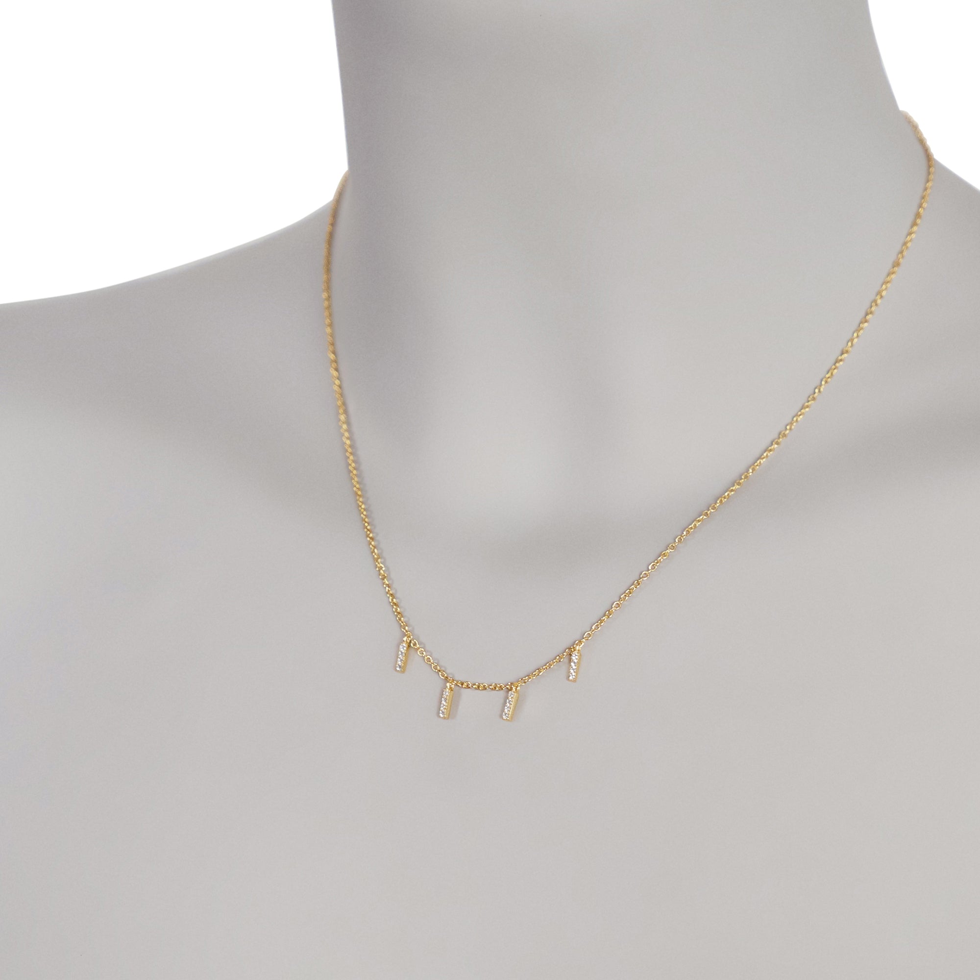 Drücke Deinen Sinn für Stil mit dieser schillernden Halskette aus. Unsere zeitgemäße Kette aus 925 Sterlingsilber verfügt über vier vertikale Stäbe, welche auf der Vorderseite mit Zirkoniasteinen verziert sind. Diese schlanken und luxuriösen Stäbe schwanken sanft an einer 38cm+ 5cm langen Gliederkette, die mit einem Federringverschluss gesichert ist. Erhältlich in Silber oder gelbvergoldet, diese Halskette mit ihrem vielseitigen Design ist unverzichtbar für Deine Schmuckkollektion. Verschönere all Deine abendlichen Looks mit dieser filigranen, zeitlos eleganten Halskette.
