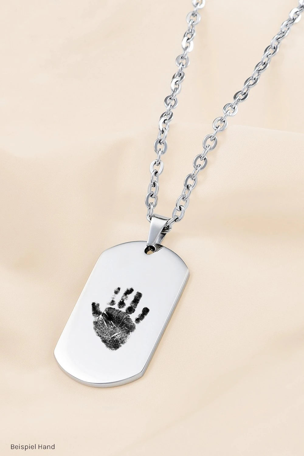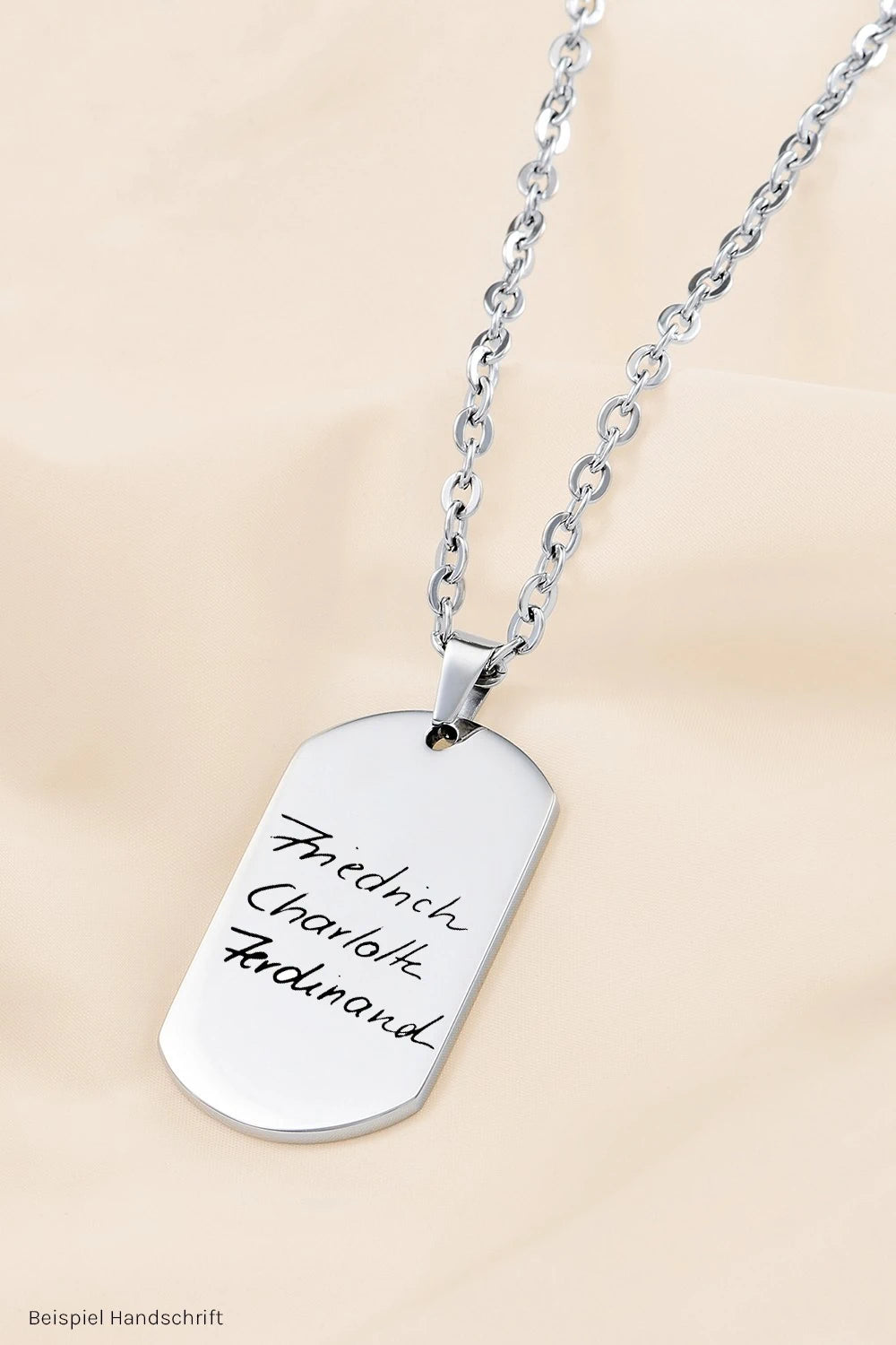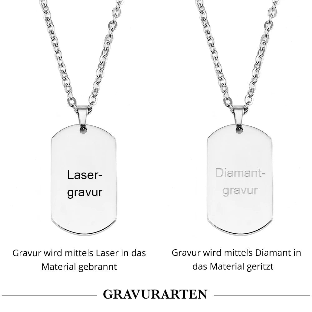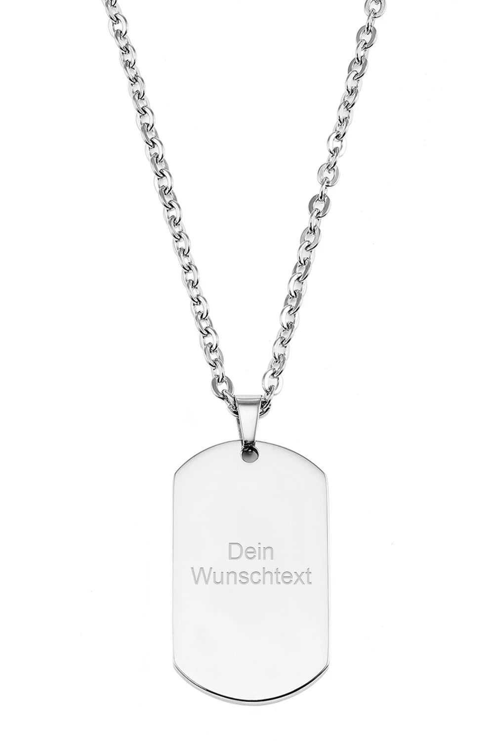 Klassische Dog Tag Herrenhalskette. Ideal auch als Geschenk geeignet, da man diesen Anhänger personalisieren kann. Die Kette eignet sich also als Überraschung für den Liebsten, Vater, Bruder, Freund, ... . Auf Vorder- und Rückseite kann ein Text, Datum, etwas handgeschriebenes von euch, ein Fuß-, Hand-, oder Pfotenabdruck oder eine Zeichnung bspw. von Kindern graviert werden.