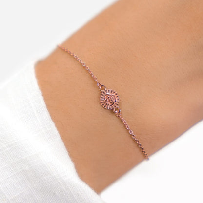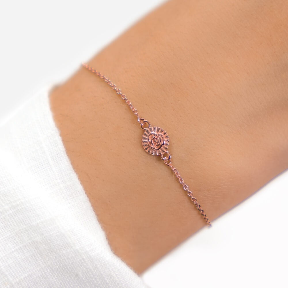 Unser hochwertiges, vintage-inspiriertes Münzarmband aus 925 Sterlingsilber besteht aus einer filigranen, dünnen Kette und einem Plättchen, auf dem eine Rose abgebildet ist.