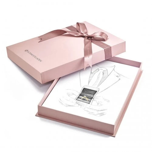 Es hat einen modernen, romantischen Look, eine matte rosa Oberfläche und eine auf das Etui befestigte, elegante Schleife. Es ist aber der Inhalt, der eine positive Überraschung verschafft – Dein Schmuckstück wird an die Zeichnung einer Frau angebracht, die Deinen Schmuck präsentiert.